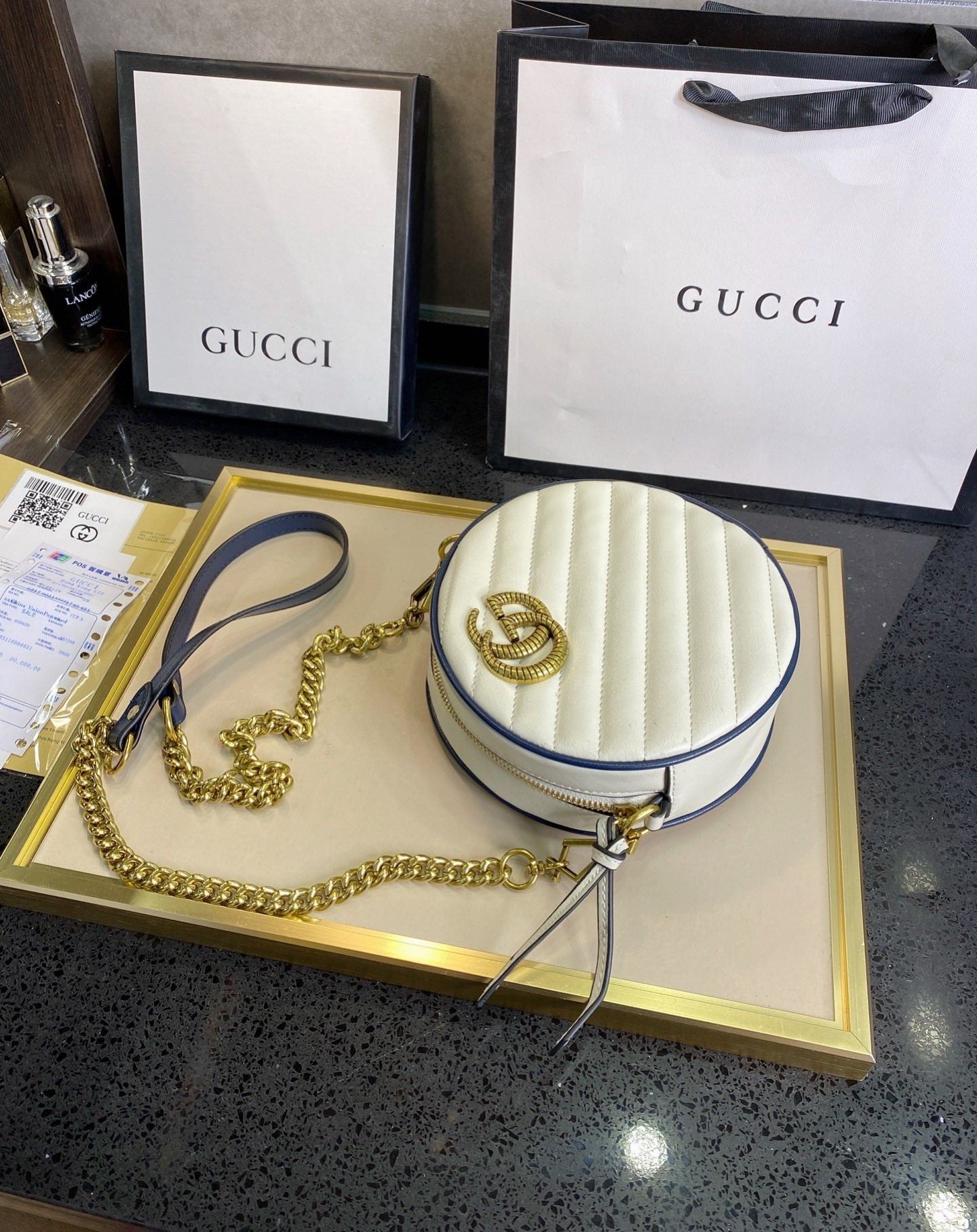 Includes Shipping bags, dustbag sleeper, care manual, booklet, tag.